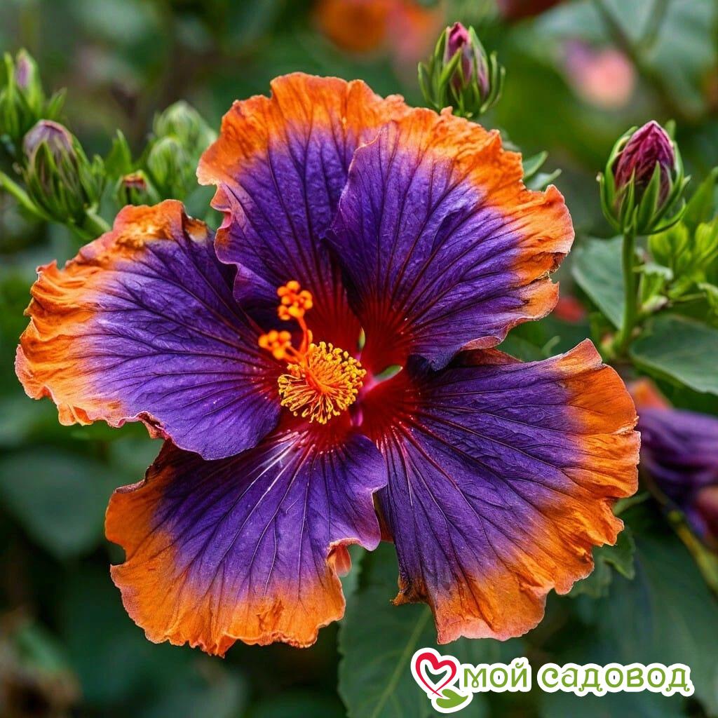 Гибискус «Оранж Спелл» — это воплощение красоты и загадки. Представьте: крупные фиолетовые цветки, словно бархатные лепестки, опалённые огнём, с яркими оранжевыми краями, словно языки пламени. Этот гибискус создан для тех, кто ценит оригинальность и хочет добавить в свой сад нотку волшебства. Его красота приковывает взгляд и дарит ощущение прикосновения к чему-то необыкновенному.