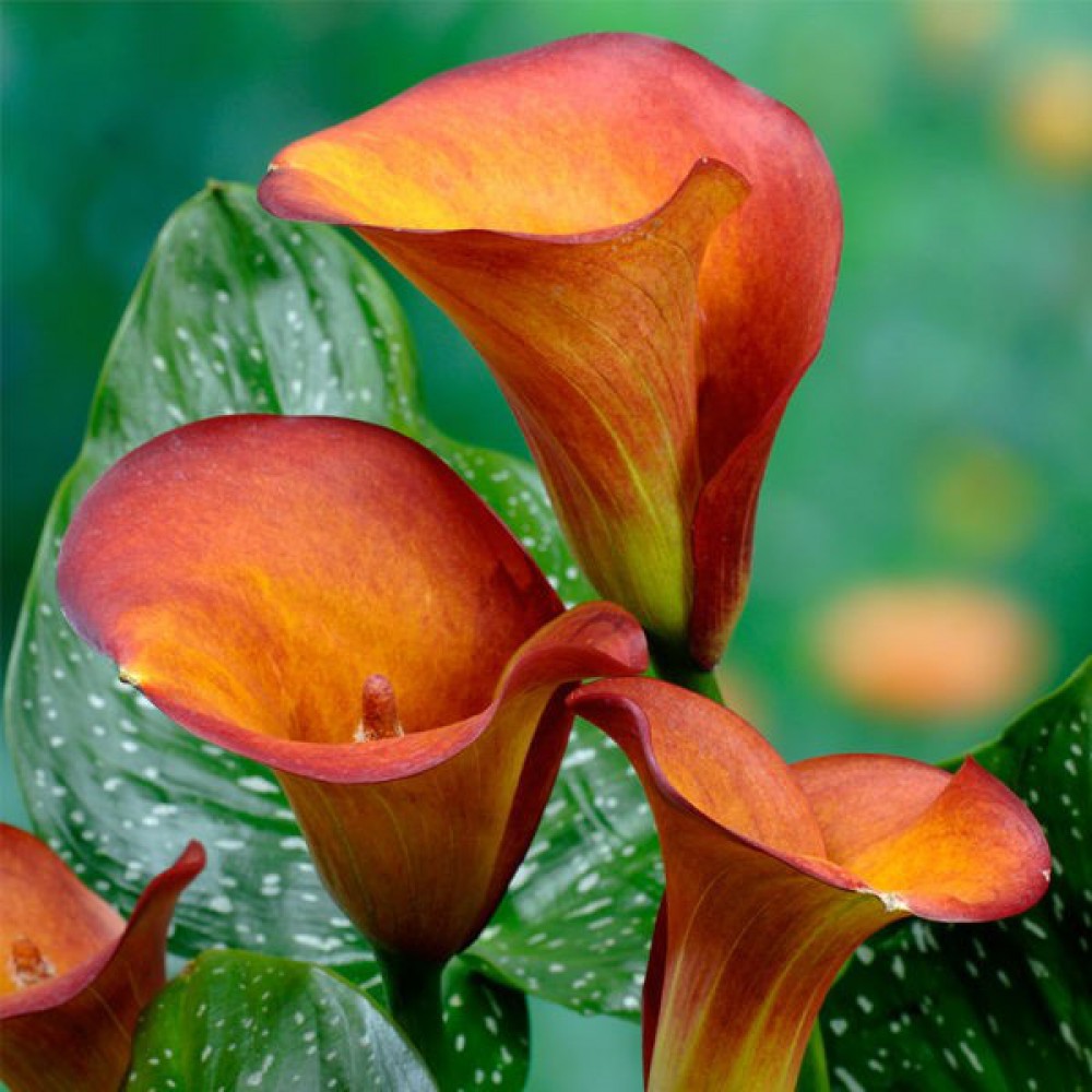 ПОСАДКА М УХОД. Рано весной в горшки для комнатной культуры, в открытый грунт — после того, как минует угроза заморозков. Клубни сажают на глубину 5-10 см и хорошо проливают почву, поскольку каллы любят влагу. Для посадки каллы подойдет притененный участок. Идеальный вариант, место под негустыми кронами деревьев. Чтобы было достаточно светло, а солнечные лучи не обжигали листьев. Очень эффектно смотрятся каллы, рядом с искусственным водоемом. Отлично цветет и растет только в тепле, где температура не ниже 18°C, самая оптимальная температура 22-23°C. Не переносит сквозняков. Цветоносы этого растения высокие, которые идут прямо от низа растения. На открытом воздухе это прекрасное растение цветет 1 месяц, а в закрытом помещении — 14 дней. Осенью растения сбрасывают листья. На зиму клубни каллы нужно выкопать и хранить в непромерзаемом помещении.